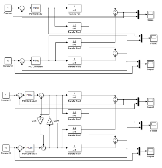 The following Simulink model is an example of a Multiple-Input Multiple-Output system. The first block is an example of two decoupled PID controllers (non-interacting) while the second block is an example of interacting PID controllers with feedforward gains.