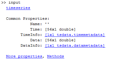 Step 2: From the MATLAB command prompt, view the "input" and "output" data that was generated from the Simulink simulation. Type "input" or "output" to inspect the information that is contained in the variable structure.