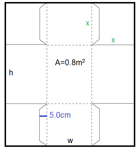 A piece of cardboard with a total area of 0.8m2 is to be made into an open-top box by first removing the corners and then by folding the box sides up and securing the tabs to the adjacent box side. The starting cardboard sheet has height h and width w. When cut and folded, the box has a width of w-2x, a length of h-2x, and a height of x. In order to properly secure the tabs to the adjacent box side, the width of the tab must be 5 centimeters (0.05m). The objective is to maximize the volume of the box by choosing an appropriate value of x (the height of the box) and w (the starting width of the cardboard sheet).