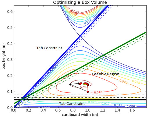 Python source code solves the box optimization problem with Newton's method, a quasi-Newton's method (BFGS), a steepest descent approach, and a conjugate gradient method. After the script executes, a figure appears that shows a contour plot of the solution with a graphical depiction of the progress of each method.