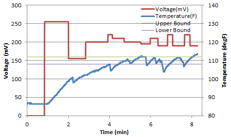 Next, a test was conducted to observe the performance of manual adjustment of the input voltage to maintain the actual temperature within the desired range of 108-112 degF. During this test, another student provided disturbances to the system by intermittently blowing on the transistor and temperature probe. These disturbances represented day-time and night-time factors, varying occupancy, and other changes that could induce a temperature change.