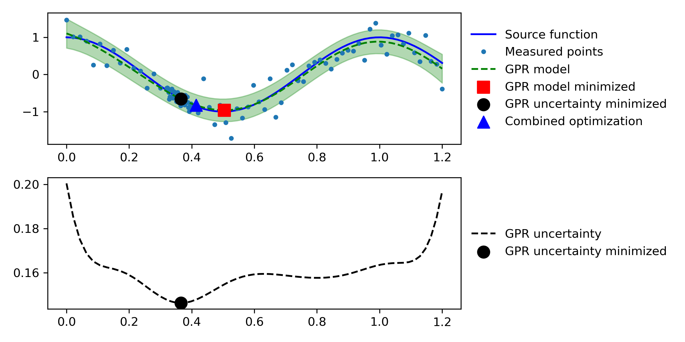 plt.scatter([opt_val2[0]],[opt_val2[2]],label='GPR uncertainty minimized',color='black',marker='o',s=100,zorder=3)