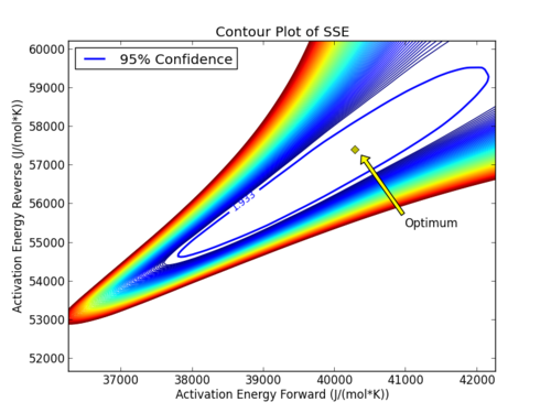 with p=2 (number of parameters), n=number of measurements, theta=[parameter 1, parameter 2] (parameters), theta* as the optimal parameters, SSE as the sum of squared errors, and the F statistic that has 3 arguments (alpha=confidence level, degrees of freedom 1, and degrees of freedom 2). For many problems, this creates a multi-dimensional nonlinear confidence region. In the case of 2 parameters, the nonlinear confidence region is a 2-dimensional space. Below is an example that shows the confidence region for the dye fading experiment confidence region for forward and reverse activation energies.