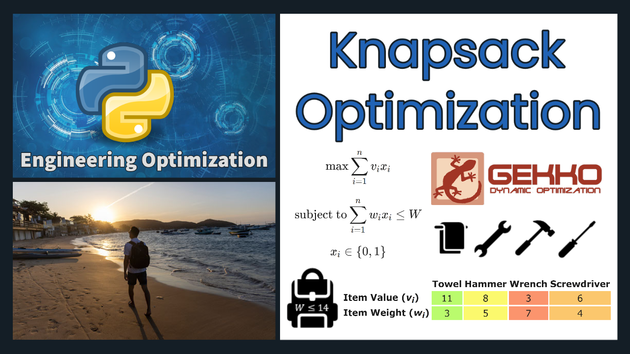 The purpose of the knapsack problem is to select which items to fit into the bag without exceeding a weight limit of what can be carried. We solve the problem with an integer programming solver (APOPT) by setting up each item as a binary variable (0 or 1). A zero (0) is a decision to not place the item in the knapsack while a one (1) is a decision to include it. More generally, suppose there are `n` items with values `v_1, \ldots, v_n` and weights `w_1, \ldots, w_n` with a total weight limit of the sack `W=14`. The decision variables are `x_1, \ldots, x_n` that can be 0 or 1. The following optimization formulation represents this problem as an integer program: