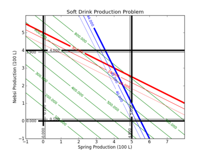 A contour plot can be used to explore the optimal solution. In this case, the black lines indicate the upper and lower bounds on the production of 1 and 2. In this case, the production of 1 must be greater than 0 but less than 5. The production of 2 must be greater than 0 but less than 4.
