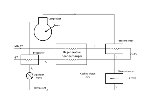 We will consider using a heat pump with a regenerative heat exchanger to do this. One possible cycle is shown in the figure below. The incoming milk is preheated in a regenerative heat exchanger and then heated further in the fore-condenser of the heat pump. As it exits the fore-condenser, the temperature of the milk is 73°C. Thereafter the milk is cooled as it flows through the other side of the regenerative heat exchanger and then through the evaporator of the heat pump.