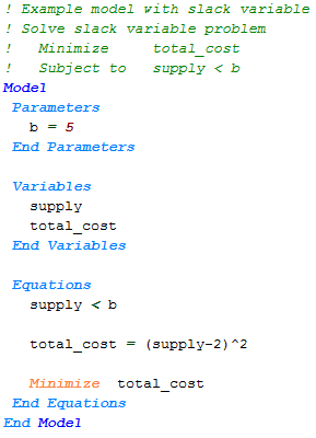 In Gekko Optimization Suite and the APMonitor Modeling Language, inequality constraints are automatically translated into equality constraints with slack variables. In APMonitor, slack variables can also be defined by starting a variable name with slk. When the model is parsed at run-time, any variable beginning with slk is automatically assigned a lower value of zero. Alternatively, inequality constraints are automatically converted to equality constraints with a slack variable.