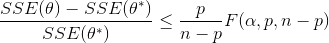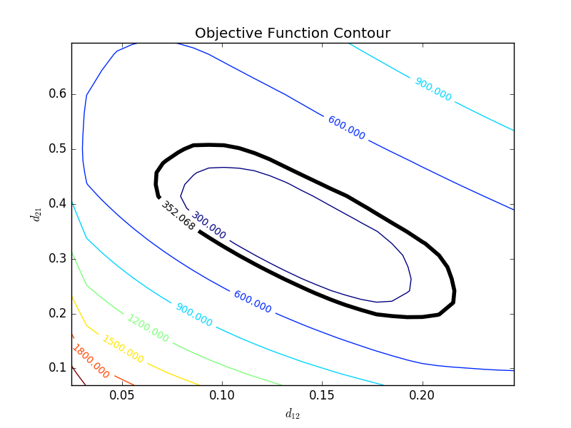 with p=2 (number of parameters), n=number of measurements, theta=[parameter 1, parameter 2] (parameters), theta* as the optimal parameters, SSE as the sum of squared errors, and the F statistic that has 3 arguments (alpha=confidence level, degrees of freedom 1, and degrees of freedom 2). For many problems, this creates a multi-dimensional nonlinear confidence region. In the case of 2 parameters, the nonlinear confidence region is a 2-dimensional space. Below is an example that shows the confidence region for the dye fading experiment confidence region for forward and reverse activation energies.