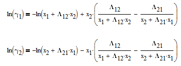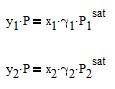 where y1is the vapor mole fraction, P is the pressure, x1 is the liquid mole fraction, gamma1 is the activity coefficient that is different than 1.0 for non-ideal mixtures, and P1sat is the pure component vapor pressure. The same equation also applies to component 2 in the mixture with the corresponding equation with subscript 2.