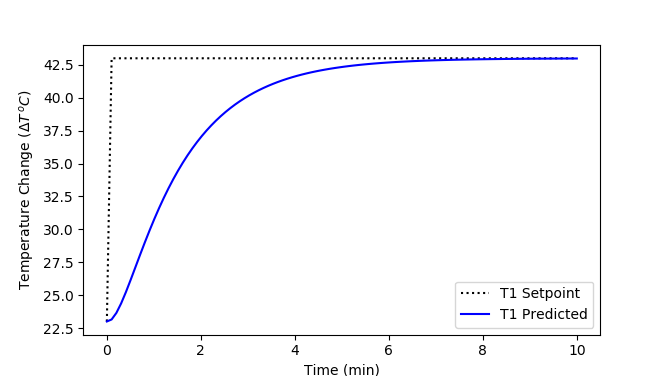 The plot shows a comparison of the predicted and measured temperature values. The ambient temperature is less than the 23oC simulated value and can be adjusted to achieve a better match to the analytic solution. However, despite the offset, the measured dynamic response of the closed-loop response is similar to the analytic solution.