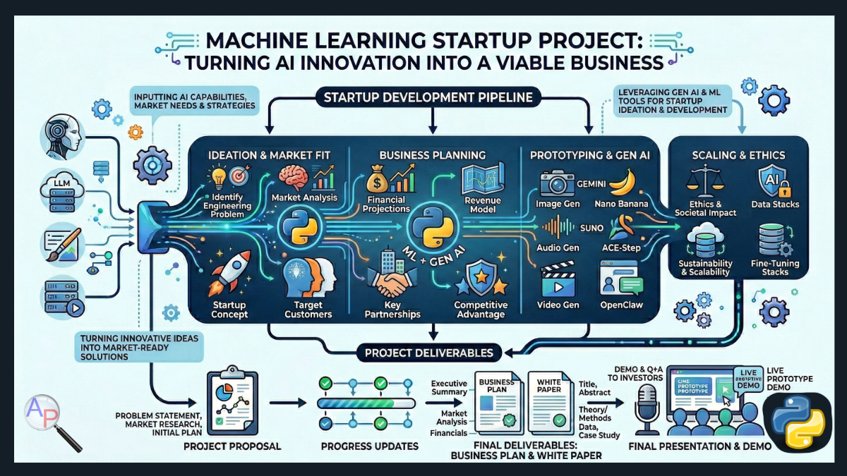 - Presentation – Present your startup concept to the class, demonstrating the ML‑powered product or service, summarizing the business plan, and showcasing the generative AI assets. Prepare for questions on technical, business, ethical, and social aspects.