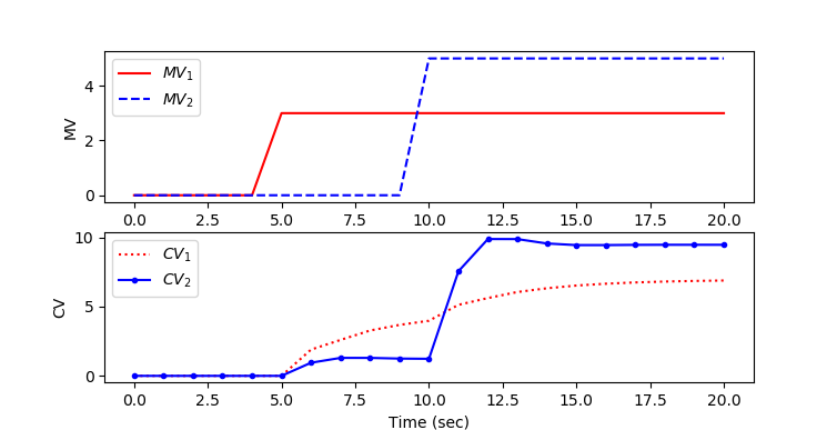 Objects sys = arx End Objects Parameters mv1 mv2 End Parameters Variables cv1 = 0 cv2 = 0 End Variables Connections mv1 = sys.u[1] mv2 = sys.u[2] cv1 = sys.y[1] cv2 = sys.y[2] End Connections File sys.txt 2 ! inputs 2 ! outputs 1 ! number of input terms 2 ! number of output terms End File File sys.alpha.txt 0.36788, 0.36788 0.223, -0.136 End File File sys.beta.txt 0.63212, 0.18964 0.31606, 1.2642 End File
