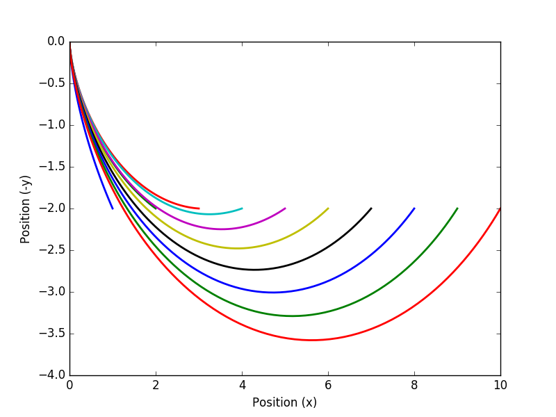 An interesting extension to this problem is to compare the solutions to when the value of x is varied from 1.0 to 10.0. The final value of y is fixed at 2.0 below the starting point.