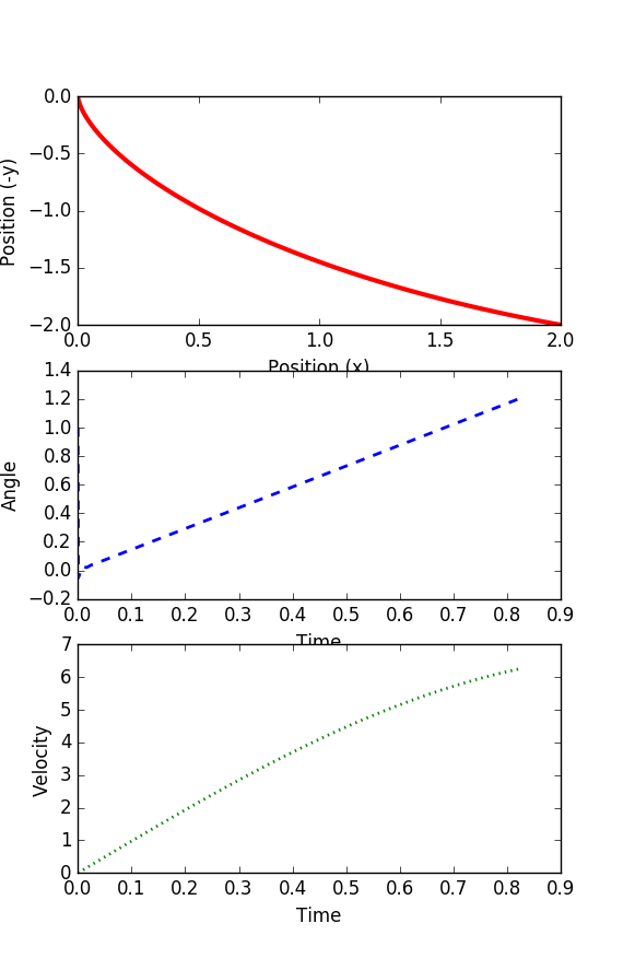 The adjustable parameter u is the slope and can be adjusted over the minimized time horizon tf. The variable x is the horizontal position and y is the vertical position in the down direction while v is the velocity. The parameter g is the gravitational constant (assume 9.81 m/s2).