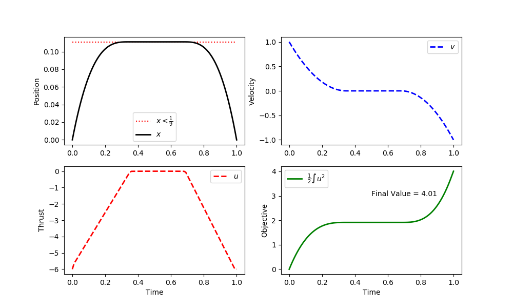 The parameter u (acceleration) is adjusted over the time horizon from a starting time of zero to a final time of one. The variable x is the position and v is the velocity.