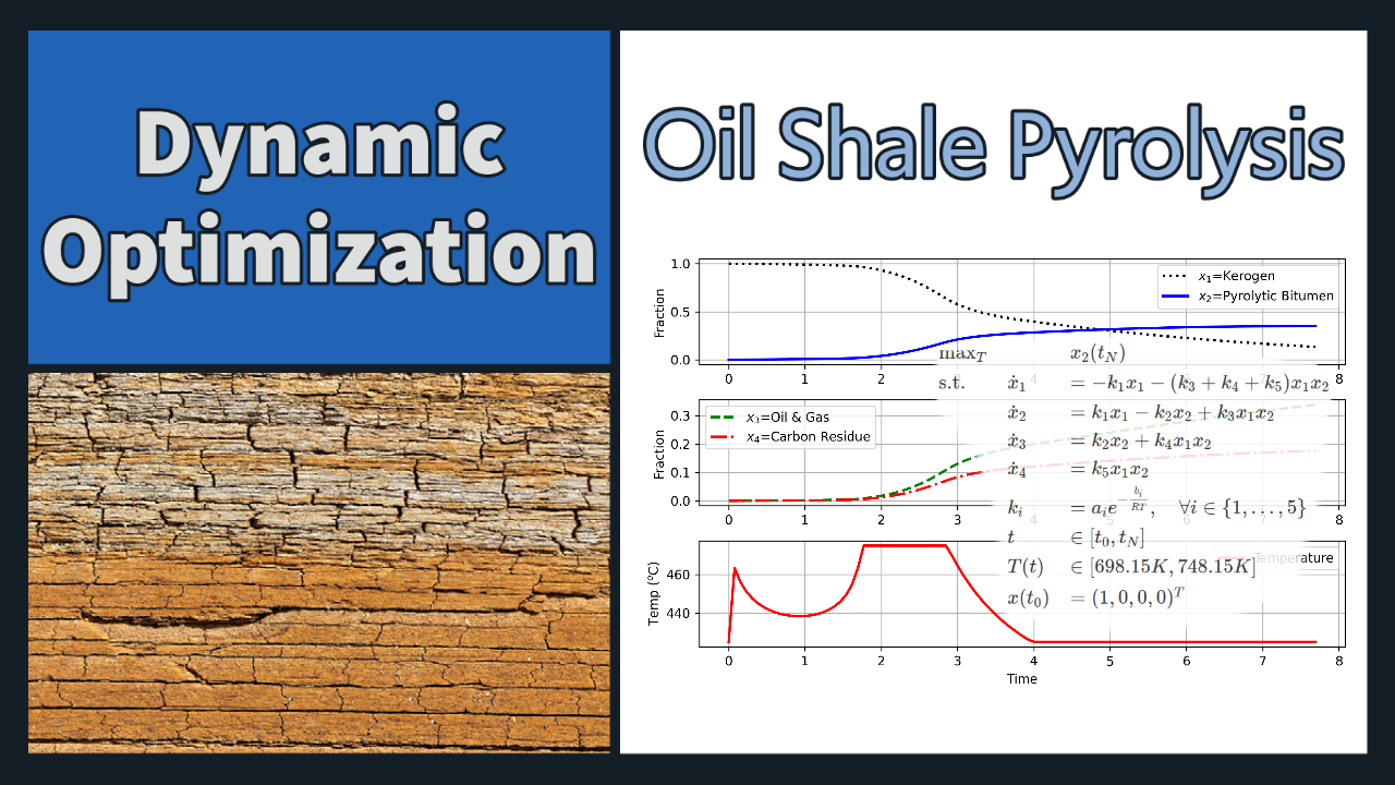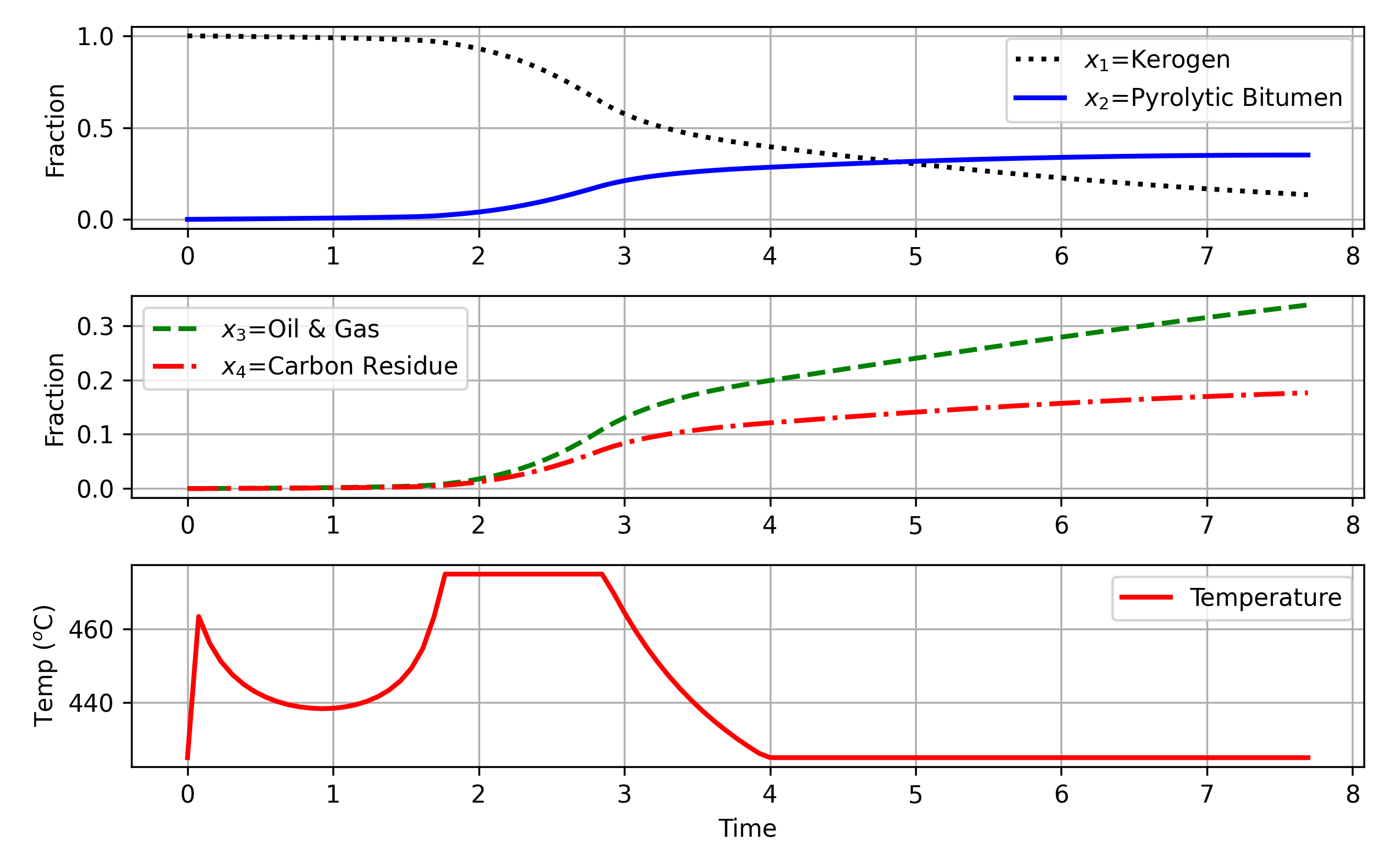In a simplified model, oil shale pyrolysis starts with kerogen and is decomposed into pyrolytic bitumen, oil and gas, and residual carbon. The objective is to maximize the fraction of pyrolytic bitumen `x_2`. There are 5 reactions including: