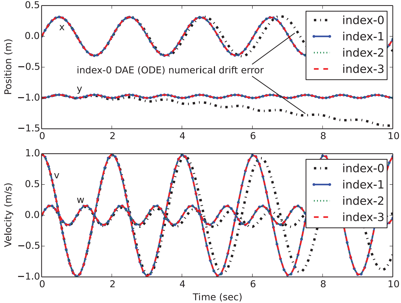 The models are mathematically equivalent but are of different index order. The most natural form is an index-3 DAE equation form, posed in terms of absolute position. The index is the number of times the equations must be differentiated to achieve an ordinary differential equation (ODE) form. This differentiation can cause numerical drift as seen in the