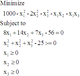 $$\begin{align}\mathrm{minimize} \quad & 100-x_1^2-2x_2^2-x_3^2-x_1x_2-x_1x_3 \\ \mathrm{subject\;to}\quad & 8x_1+14x_2+7x_3=56 \\ & x_1^2+x_2^2+x_3^2\geq25 \\ & x_1,x_2,x_3\ge0 \end{align}$$