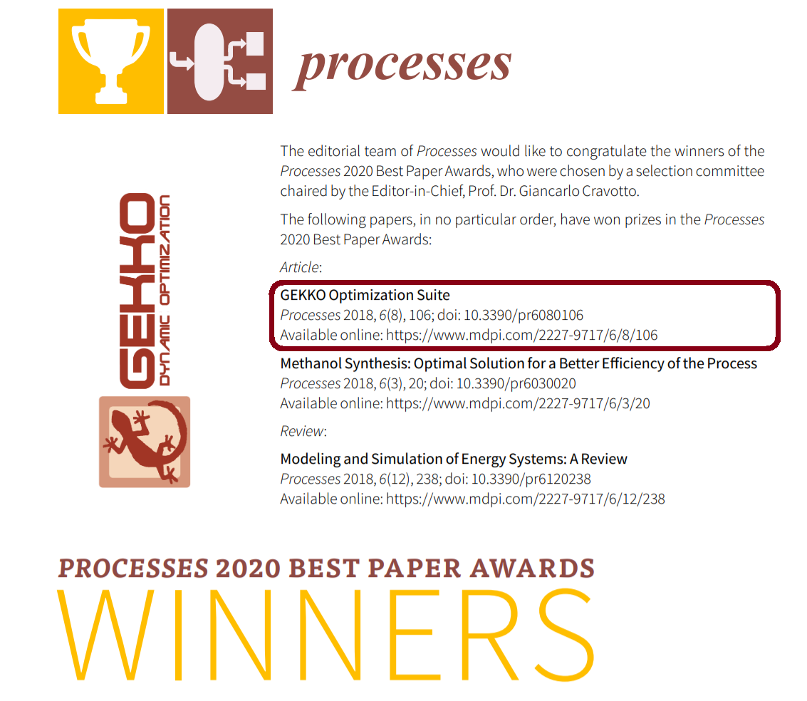 The GEKKO Optimization Suite paper was selected as a 2020 Best Paper by the journal Processes. This is one out of about 1500 papers published by the journal that are awarded based on metrics for impact and citations.
