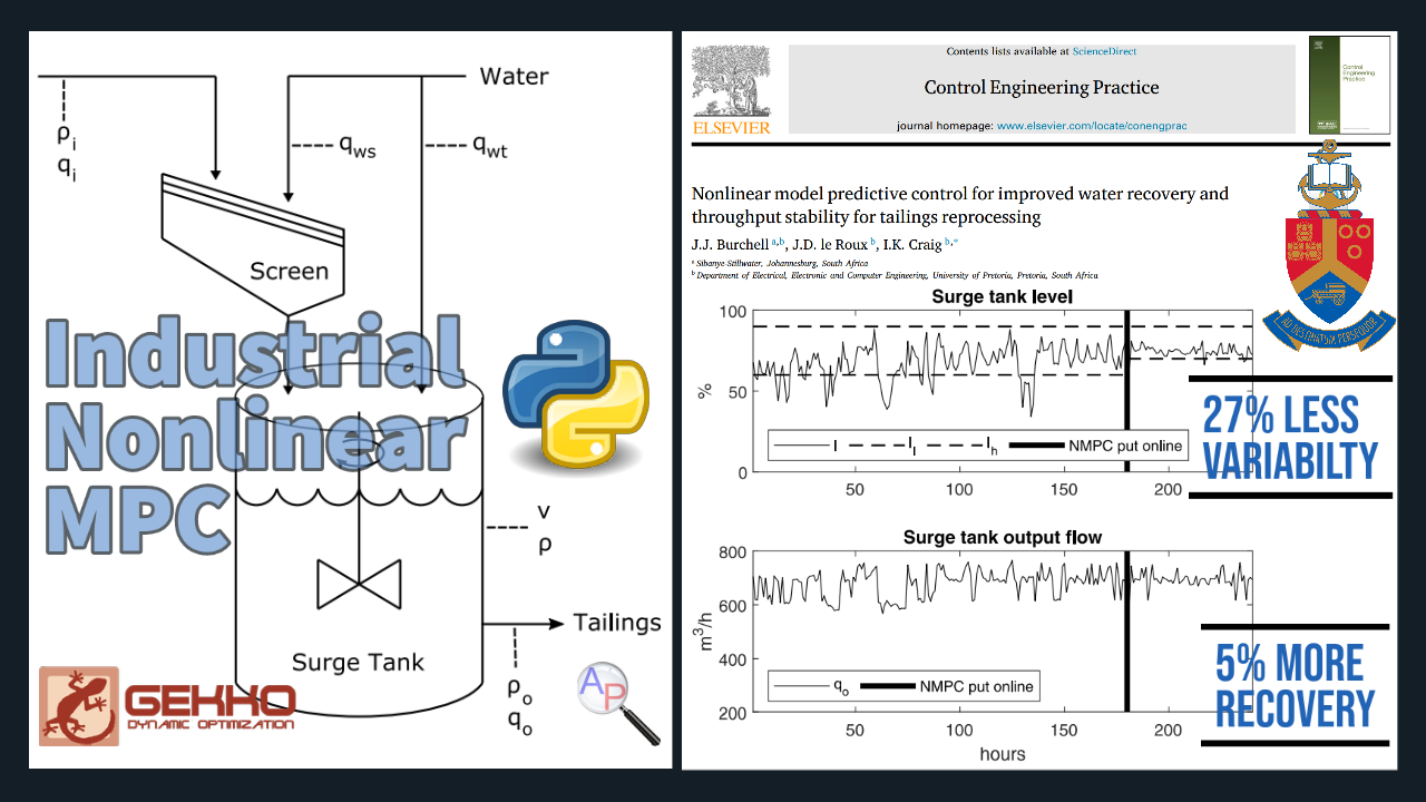 There are many applications of model predictive control and optimization with Gekko. One example is nonlinear Model Predictive Control (MPC) for 💦 water recovery in tailings reprocessing in South Africa.