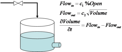 model Tank parameter Real c1=0.25 "Inflow Constant"; parameter Real c2=0.14 "Outflow Constant"; Real percent_open "Percent Open"; Real inlet_flow "Inlet Flow"; Real outlet_flow "Outlet Flow"; Real volume "Tank Volume"; equation inlet_flow = c1 * percent_open "Inlet flow"; outlet_flow = c2 * volume^0.5 "Outlet flow"; der(volume) = inlet_flow - outlet_flow "Mass balance"; end Tank;