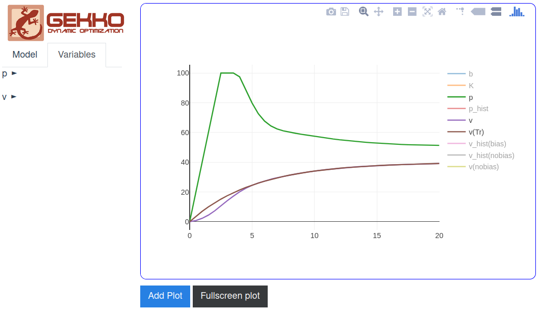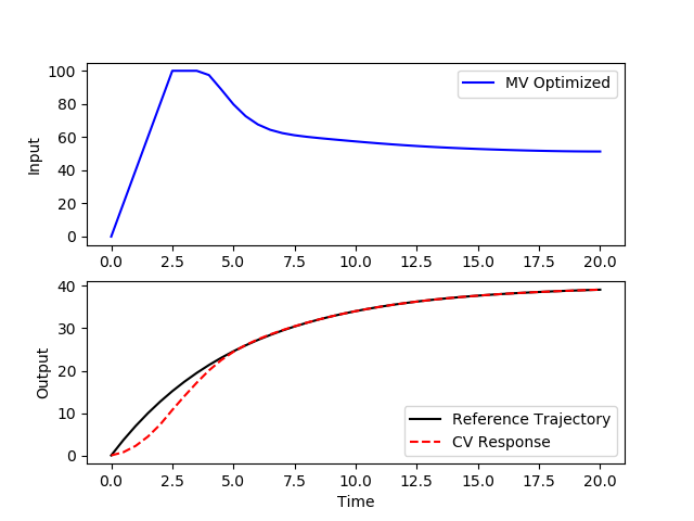 Model Predictive Control (MPC) is also available in the newer Gekko interface with the control option m.options.IMODE=6. A plot of the results can be generated with a plotting package such as Matplotlib. Every time the m.solve() command is called, the solution is time-shifted by one cycle and the MPC calculation repeats with the updated measurements or set points.