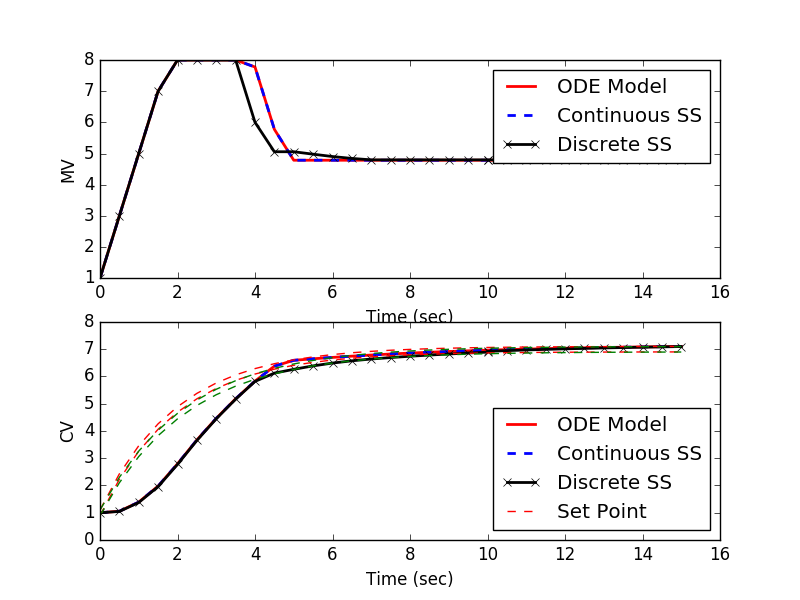 Continuous and discrete state space models are used in a Python script for Model Predictive Control. A newer version of the APM Python library is Python Gekko.