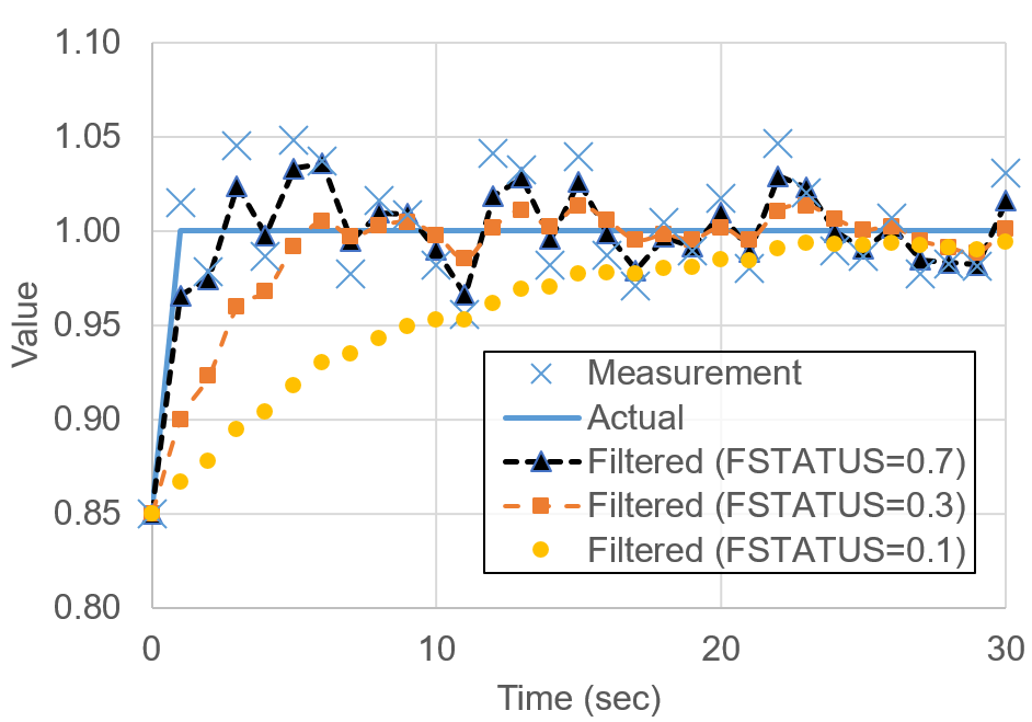 The actual process value steps from 0.85 to 1.0 and the measurement is the true value with random white noise. The Filtered trends show the value of MEAS used in the model simulation with varying levels of FSTATUS. Lower values of FSTATUS (such as 0.1) require more cycles to update to true measured values but are also less sensitive to noise (random fluctuations). A higher value of FSTATUS (such as 0.7) incorporates more of the measurement information but does not filter out the random fluctuations as well. FSTATUS should be chosen as a balance between these trade-offs.