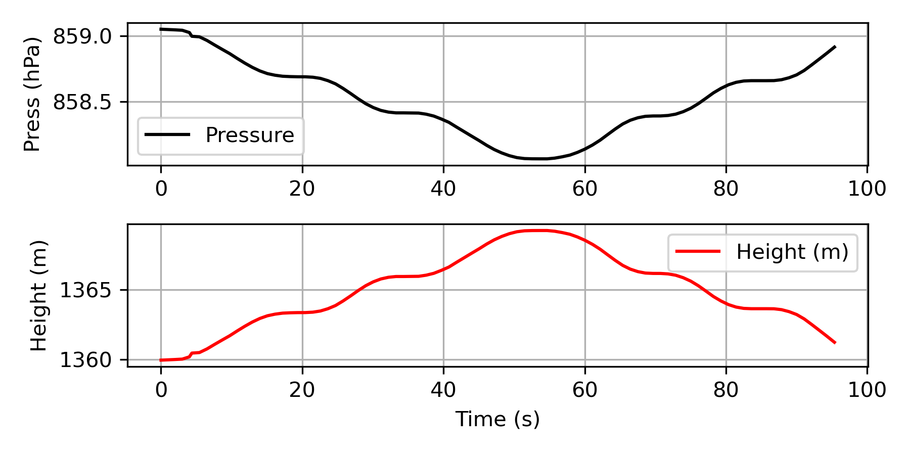 The difference in elevation is observable as a change in pressure between the two airports and can be used to check the beginning and ending pressures. Atmospheric conditions cause natural variation in the pressure at the same altitude. See the relationships between air pressure and elevation with the BMP280 sensor material.